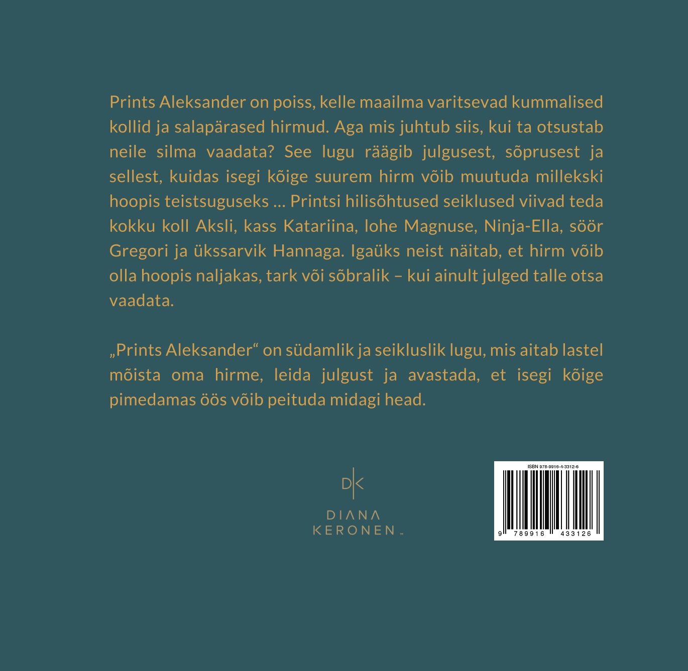 „Prints Aleksander“ on lugu poisist, kelle maailma ilmuvad üsna ootamatult kummalised kollid ja salapärased hirmud. Aga mis juhtub siis, kui ta otsustab neile päriselt silma vaadata? Selgub, et isegi kõige hirmutavamad tegelased võivad olla hoopis naljakad, head, targad või lihtsalt sõbrad, kes ootavad ärakuulamist.